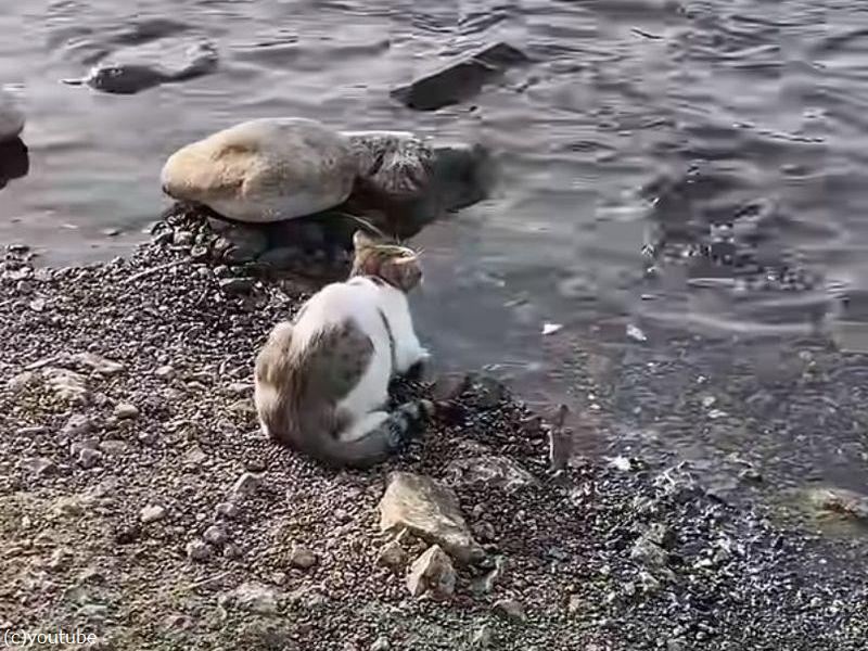 海で漁をする猫「魚をワイルドにキャッチ…」(動画)