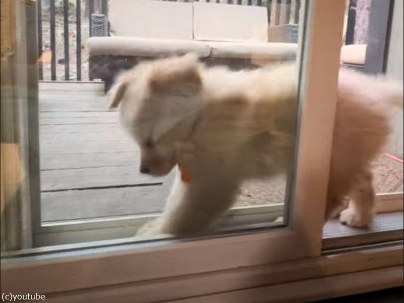子犬が窓のすき間に入って…すごい顔になる(動画)