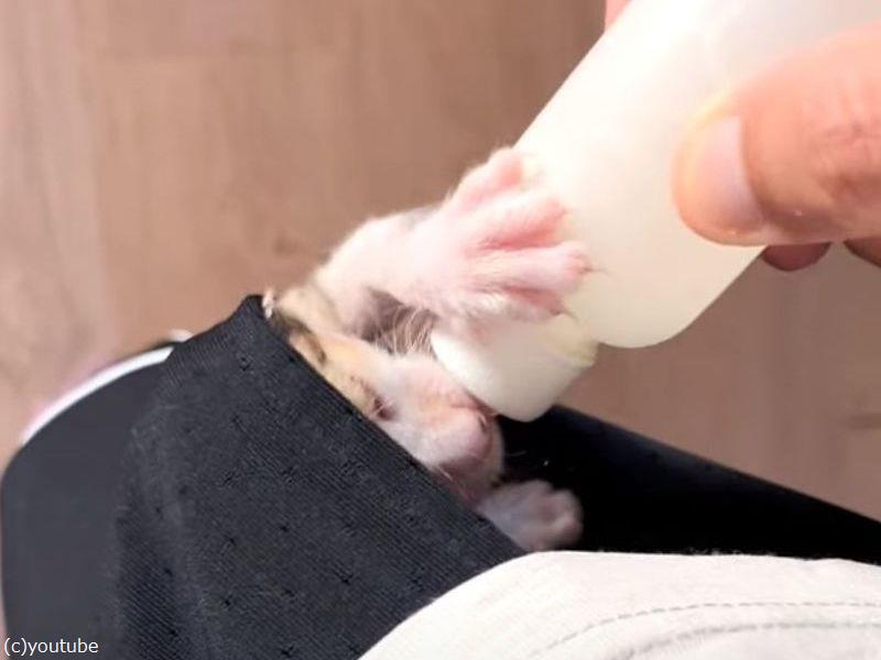 「まるでカンガルー」猫の赤ちゃんがポケットの中から哺乳瓶でごはんタイム(動画)