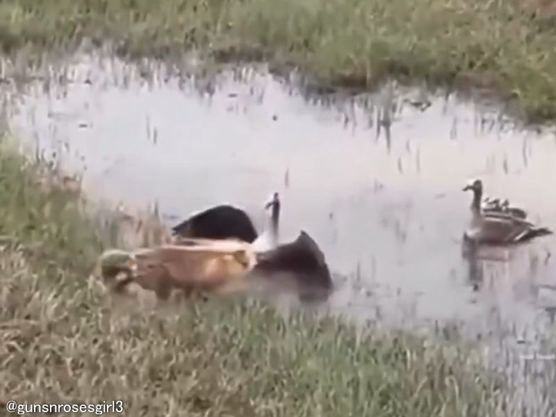 ガン類のオスは強い防衛本能を持つことが多く、つがいの安全や子孫を守る役割を自ら引き受けることがあるとのことです。