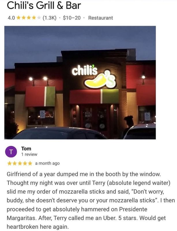 ●テリーが仲間にモッツァレラスティックをサービスしてくれた話は好きだよ。でも投稿者はレビューでそれに触れなかった。テリーをトラブルに巻き込みたくなかったんだ。