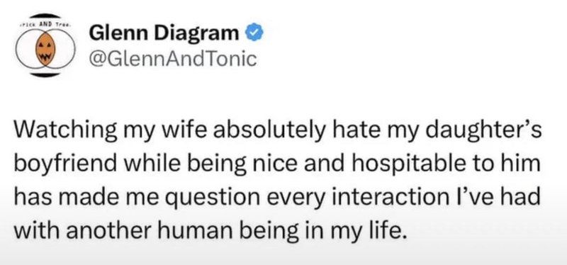 「妻は娘の彼氏を心底嫌っているのに、親切にもてなしているのを見て、これまでの人生で他人と交わした全ての交流を疑わざるを得なくなった」
