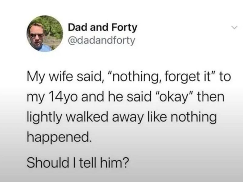 「妻が14歳の息子に『何でもないわ、もう忘れてちょうだい』と言った。息子は『わかった』と答えて、何事もなかったかのように軽い足取りで去っていった。彼に言うべきだろうか?」