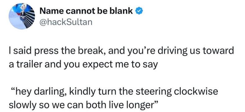 「トレーラーに突っ込もうとしているところを、『ブレーキ踏め!』と言ってるんだよ。そんなときに、『ねぇ、ダーリン、ゆっくりとハンドルを右に回してみようか、そうしたらきっと一緒に長生きできるはず』なんてのを期待してるのか?」