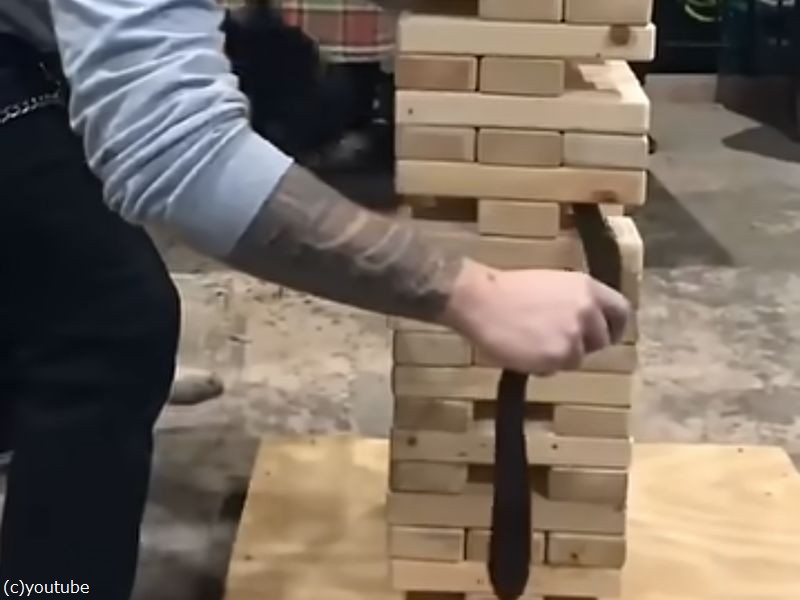 「巨大ジェンガの中心をベルトを使って引っこ抜いてみたら…」(動画)